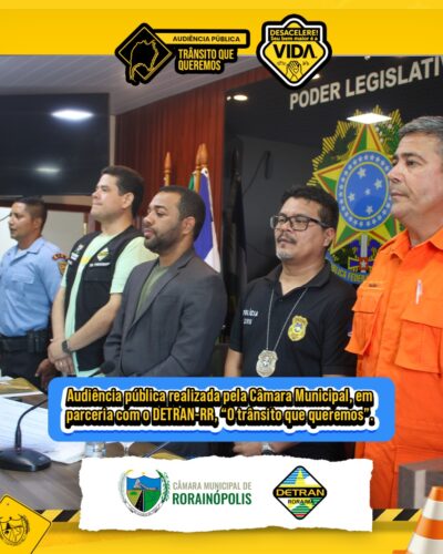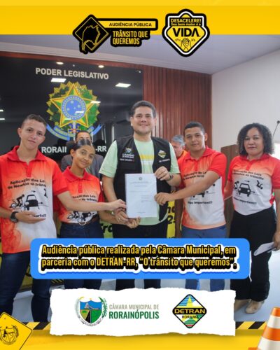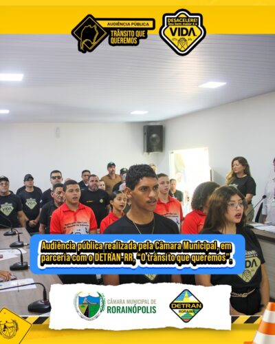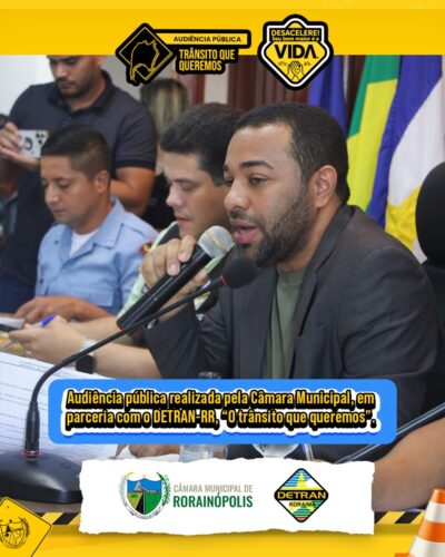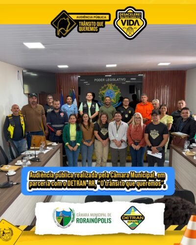 Audiência pública “O trânsito que queremos”, realizada pela Câmara Municipal de Rorainópolis, em parceria com o DETRAN-RR. O evento contou com a presença do diretor-presidente Diego Brandão, vereadores, autoridades da Polícia Militar, Polícia Civil, Corpo de Bombeiros, SAMU, equipe do DETRAN-RR, além da população em geral e interessados das demais classes. Juntos, debateram e construíram propostas para um trânsito mais seguro e humano na nossa cidade.